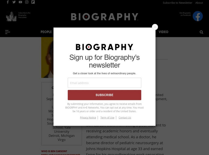 Staff biography of Dr. Benjamin Carson. Page briefly details Dr. Carson's involvement with Johns Hopkins Medical Center, his education and training, his certifications and current appointment as well as books that he has written....