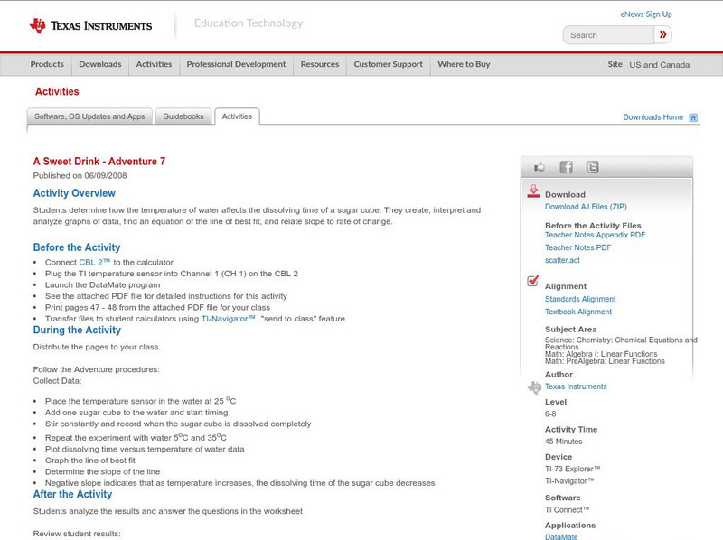 Students determine how the temperature of water affects the dissolving time of a sugar cube. They create, interpret and analyze graphs of data, find an equation of the line of best fit, and relate slope to rate of change.