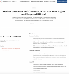 Teach the class to separate fact from fiction. Scholars explore the topic of fake news as they read PEN America's News Consumers' Bill of Rights and discuss the rights and responsibilities outlined in the bill. Next, they read an article...