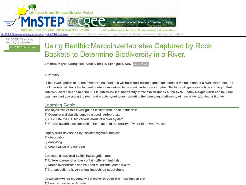 In this investigation of macroinvertebrates, students will build rock baskets and place them in various parts of a river to collect insects. Students will group insects according to their pollution tolerance and use the PTI to determine...