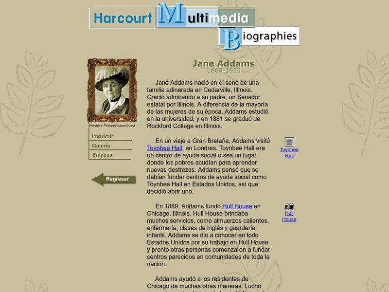 In Spanish, learn of this accomplished woman's endeavors to improve the lives of the poor and disadvantaged. Jane Addams famous "Hull House" was copied throughout the U.S. Pictures and other links as well. (In Spanish)