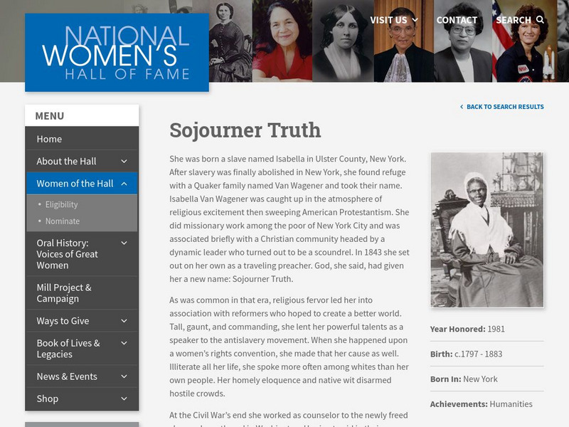 The National Women's Hall of Fame provides a brief biography of the famous abolitionist and former slave, Sojourner Truth.