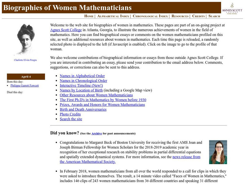 Use this site to learn about the women behind the math. Lawrence Riddle, professor of mathematics at Agnes Scott College, created this site as a tribute to women who have made accomplishments in the world of mathematics.