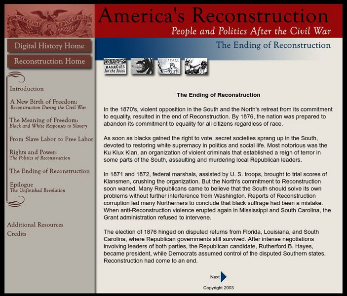 A very clear document outlining the various reconstruction plans, the problems for both whites and blacks during Reconstruction, and the amendments added concerning the abolition of slavery, civil rights, and suffrage. Requires Adobe...