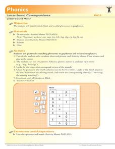 Boost initial, medial, and final sound correspondence. Scholars practice decomposing word sounds using image cards and a worksheet. Learners cut out 10 three-letter images, sound them out, and glue them on the worksheet. Each word is...