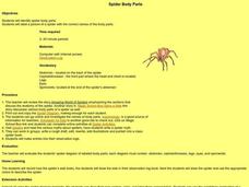 Students identify spider body parts. In this arachnid lesson, students review the story Amazing World of Spiders and discuss the various spider body parts. Students fill in the correct body parts on a copy of a blank spider diagram....