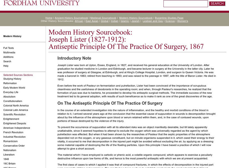 Fordham University: Modern History Sourcebook: Joseph Lister Antiseptic Principle