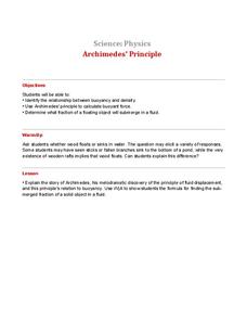 In this buoyancy worksheet, students read about why objects float or sink. Students apply the Archimedes' Principle in a buoyancy lab. Students complete 1 graphic organizer.