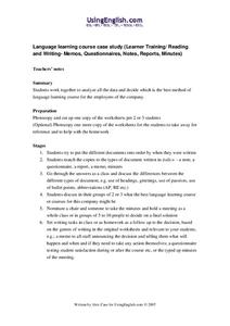 Pupils analyze data concerning possible language learning training. In this business and language learning course, students work in groups to analyze data and determine which is the best method of language learning for a group of employees.