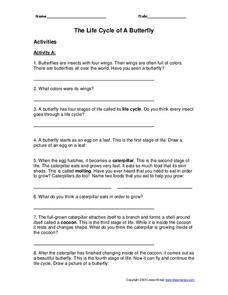 In this life cycle of a butterfly worksheet, students answer 7 short answer questions, draw a picture of a butterfly, answer 4 vocabulary questions and fill in 6 fill in the blank statements about butterflies.