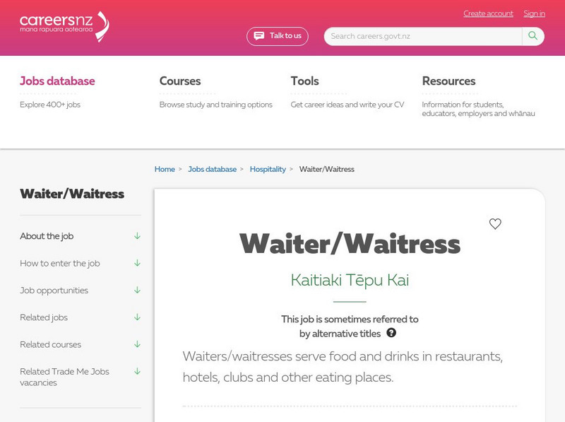 This site contains detailed information about the waiter/waitress career field. While this site is based out of New Zealand and contain information for that country, there is valuable data that is useful about this career.