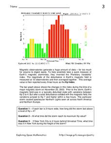 In this magnetic storms and Earth's magnetic field worksheet, students use a bar graph showing the Kp Index for planetary variability. Students use the bar graph to answer 3 questions about the solar storms and their Kp values.
