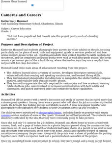 Applying photography basics they learn for this project, first graders take pictures of an adult at work focusing on the tools used, the work site, and job responsibilities. After making a career book that includes photos and...