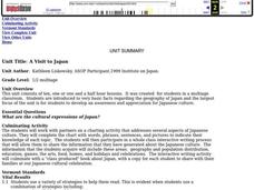 Students are introduced to the culture and geography of Japan in his ten lessons unit. The cultures of indigenous peoples in various times in their local community are explored through a variety of art forms, listening, writing, and...