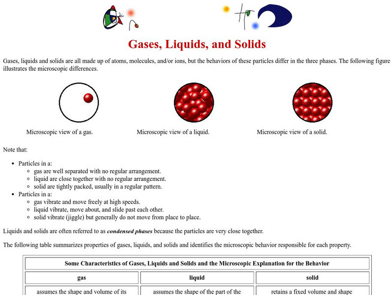 This site has a brief description of the differences in particles in a gas, liquid, and solid. Animated microscopic pictures demonstrate the molecular movement in each state. Information is then summarized in an easy-to-read chart.
