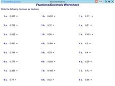 Young scholars convert fractions to decimals. They are shown how to convert fractions to decimals through teacher demonstration on the board. A 20-problem worksheet and answer key are included.