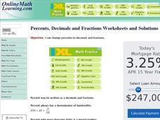 In this Algebra I worksheet, 9th graders convert percentages to decimals and fractions. The one page interactive worksheet contains ten problems. Answers and a hint are provided.