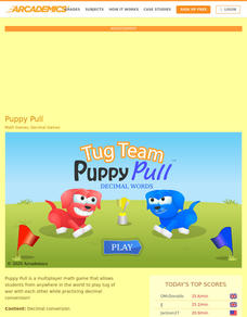 Pull hard to convert fractions. Players participate in a tug of war against each other or the computer by practicing converting fractions to decimals. With each correct response, the player's puppy pulls a little harder. Play continues...