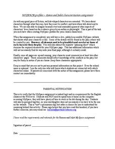 In this Romeo and Juliet worksheet, students create a MySpace website as a characterization analysis for the play Romeo and Juliet. Students complete a characterization sheet for the activity.