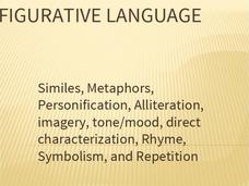 Explore literary devices and figurative language using higher level examples. The 33 slides here define common types of figurative language (like simile, metaphor, personification, etc.), and then focus on specific examples in...