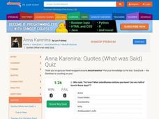 In this online interactive reading comprehension worksheet, learners respond to 5 multiple choice questions based on quotes in Anna Karenina. Students may submit their answers to be scored on this timed quiz.