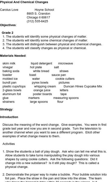 This lesson plan focuses on the difference between physical and chemical changes of matter.