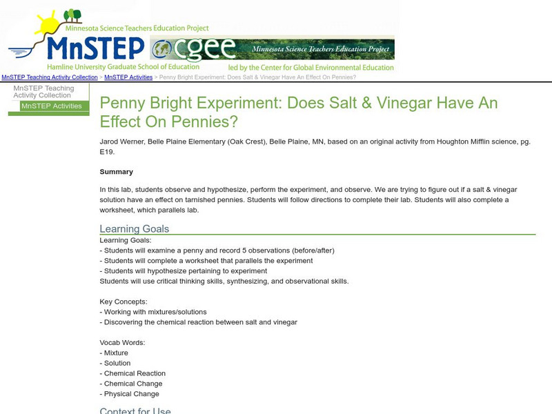 During this lab students will experiment to see whether a salt and vinegar solution can clean a tarnished penny. Included on site is lesson plan and student worksheet.