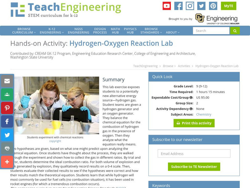 Teach Engineering: Hydrogen Oxygen Reaction Lab