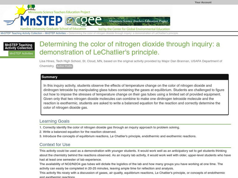 Learners observe the effects of temperature change on the color of nitrogen dioxide and dinitrogen tetroxide by manipulating glass tubes containing the gases at equilibrium. Then, they write a balanced equation for the reaction and...
