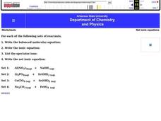 In this ionic equations worksheet, students write the balanced molecular equation, ionic equation, spectator ions, and net ionic equation for 4 chemical reactants. This worksheet has 4 problems to solve.