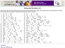 In this balancing equations worksheet, learners balance 10 reactions and indicate the type of reaction each is such as synthesis, decomposition, or single replacement.