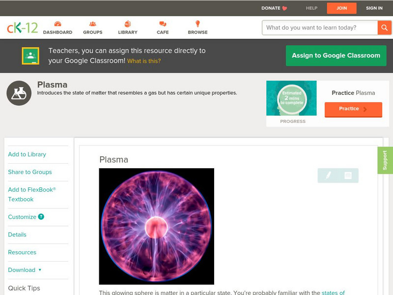 [Free Registration/Login may be required to access all resource tools.] Properties of matter in the plasma state and where plasma is found.