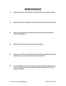 For this solids worksheet, students explain why solids are more dense than other states of matter. Students compare ionic solids and covalent network solids. This worksheet has 6 short answer questions.