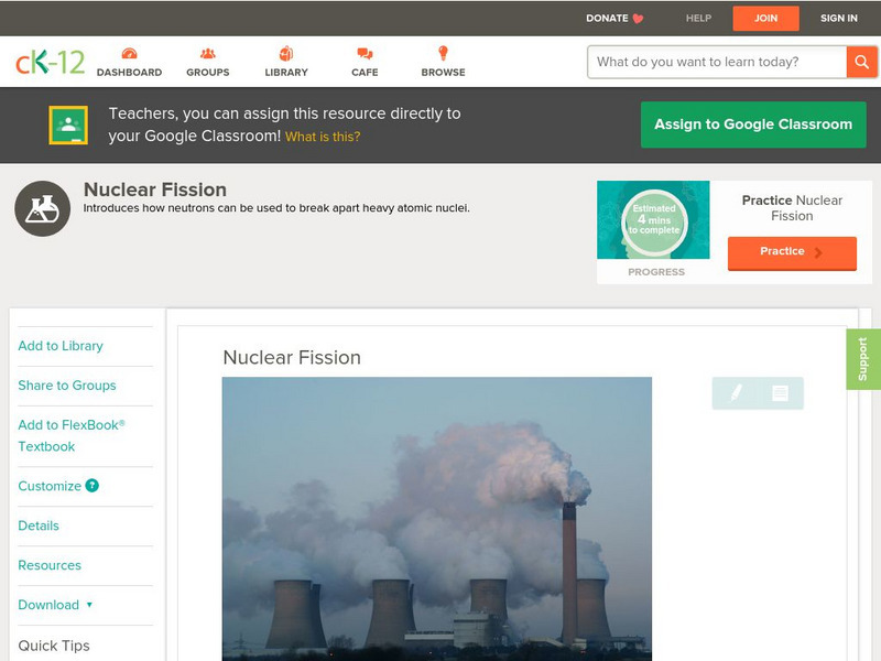 [Free Registration/Login may be required to access all resource tools.] What happens during nuclear fission and what a nuclear chain reaction is. How nuclear fission can be used to produce energy and the pros and cons of using that energy.