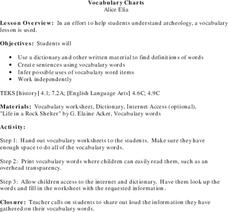 Help your kids learn their vocabulary with a lesson plan and graphic organizer. After receiving a list of new vocabulary words, learners look up the definitions in dictionaries and fill in the worksheet. Additionally, they include a...