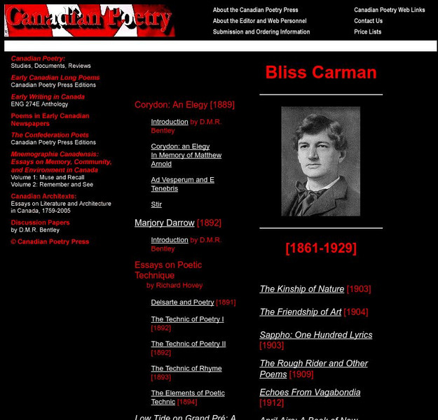 A great resource on Confederation poet Bliss Carman. This site provides numerous primary texts and essays on Carman's writing style.