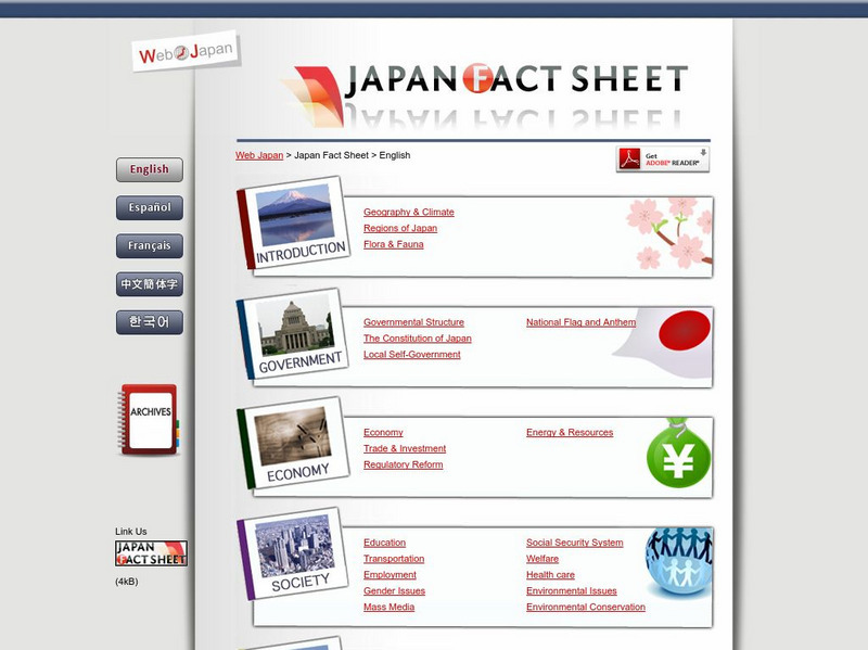 This site actually provides a number of "fact sheets" on a range of topics related to Japan's geography, government, economy, culture, society, and sports. Read online or download handy PDF documents for classroom use. The site has...