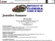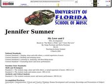 Students practice singing the song "My Love And I" by Sonja Poorman and Berta Poorman in this High School music lesson plan for the SSA choir. Emphasis is placed on proper singing techniques. This is part of a unit of lessons on this...