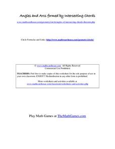 In this angles in circles learning exercise, 10th graders solve 10 different problems that include tangents and chords and intersecting chords. First, they find x when given 2 intersecting chords. Then, students determine x given the...