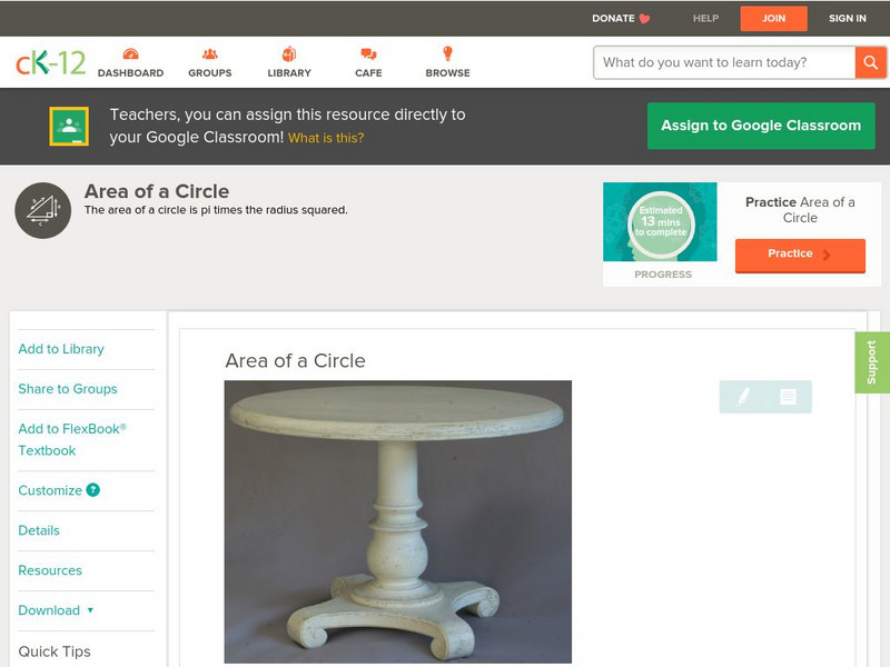 [Free Registration/Login may be required to access all resource tools.] This concept teaches students how to calculate the area of a circle. Students examine guided notes, review guided practice, watch instructional videos and attempt...