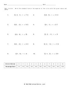 In this circles worksheet, 10th graders solve 10 different problems that include determining various types of circles. They write the standard form of the equation of the circle with the given radius and center. Then, students solve each...