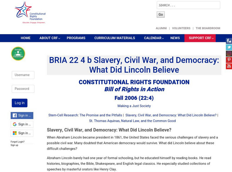 Constitutional Rights Foundation: Slavery, Civil War, and Democracy: What Did Lincoln Believe?