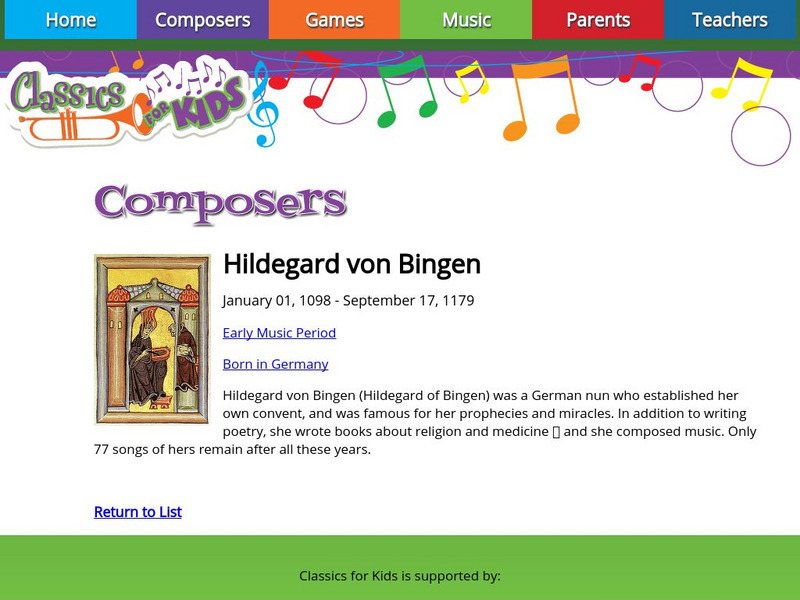 Classics For Kids provides a short biography of Early Music composer Hildegard von Bingen, born on January 1, 1098.