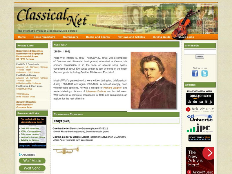 Classical Net provides a brief list of songs by composer, Hugo Wolf, and also includes an image.
