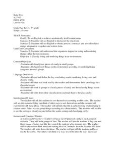 First graders critically analyze living and nonliving objects, then develop a list of characteristics to classify objects on a science walk. They make a book to close out the lesson.