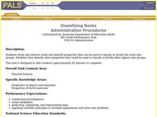 First graders examine rocks. In this rock lesson, 1st graders look at the properties of rocks and classify them. They discover the three types of rocks: sedimentary, metamorphic, and igneous.
