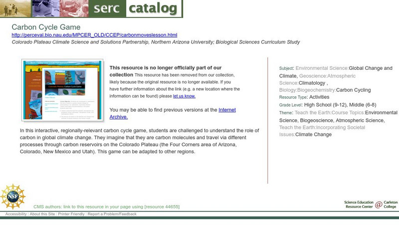 In this interactive, regionally-relevant carbon cycle game, students are challenged to understand the role of carbon in global climate change. They imagine that they are carbon molecules and travel via different processes through carbon...