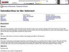 Students conduct a brief overview of the Internet in four main sections: Background of the Internet, E-mail, Web Browsing, and Web Searching. The latter three sections of this unit cover the mechanics as well as the underlying concepts...