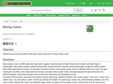 Students understand why we see various colors. In this mixing colors instructional activity, students experiment with different food coloring to explore how colors are made. Students record on a data sheet the colors they see.