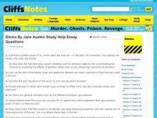 In this literature worksheet, students respond to 25 short answer and essay questions about Jane Austen's Emma. Students may also link to an online interactive quiz on the novel at the bottom of the page.